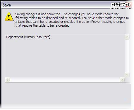 我们讨论的这个警告信息显示如下,当我试着更改AdventureWorks数据库< HumanResources.Department>表[GroupName]字段的"Allow Nulls"设置时,下面的警告产生了。