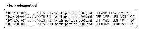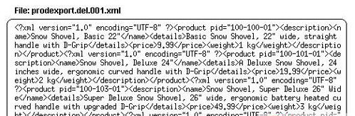 在这个例子中,导出实用程序生成的另一个文件是 prodexport.del.001.xml,该文件包含 XML 内容。导出的每个 XML 数据都被连接在一起写入到这个文件中。下面是 prodexport.del.001.xml 文件的内容。