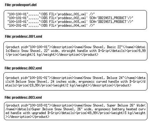 在这个例子中,PRODUCT 表的关系数据被导出到 prodexport.del 文件。然后,所有 XML 数据都被写入到 XML TO 子句指定的目录 d:\xmlpath 中。包含 XML 数据的文件被命名为 proddesc.ext.xml,其中 ext 是一个序列号(例如 proddesc.001.xml、proddesc.002.xml、proddesc.003.xml 等)。基本文件名是用 XMLFILE 选项定义的。