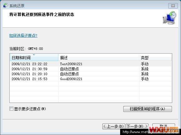 3、直接在WINDOWS 7平台操作还原,也就是上文图2中的“系统还原”按钮(开始——所有程序——附件——系统工具——系统还原也可以),为了确保让用户更加明了还原后的结果,我们通过对还原点的分析“通过扫描受影响的程序”来预览一下还原后将会有哪些更改,如下图,选中一个还原点,然后点下面的按钮即可看到。