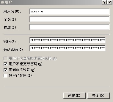 下面就到了该对SERV-U进行安全设置的时候了首先建立一个WINDOWS账号ERVU密码也需要足够的复杂密码要记住如果记不住就暂时保存在一个文件里,一会儿还要用到。(见图8)