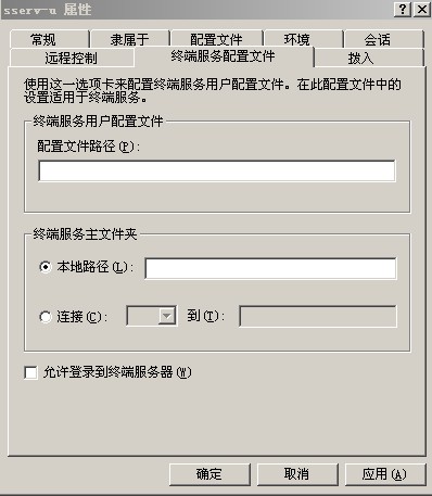 从“终端服务配置文件”选项里取消“允许登录到终端服务器(W)”的选择,然后点击确定继续我们的设置。(见图10)