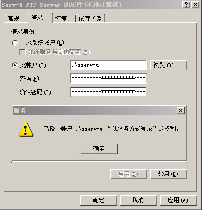 现在,在服务里重启Serv-U FTP Server服务就可以正常启动了。当然,到这里还没有完全设置完,你的FTP用户因为没有权限还是登录不了的,所以还要设置一下目录的权限。
