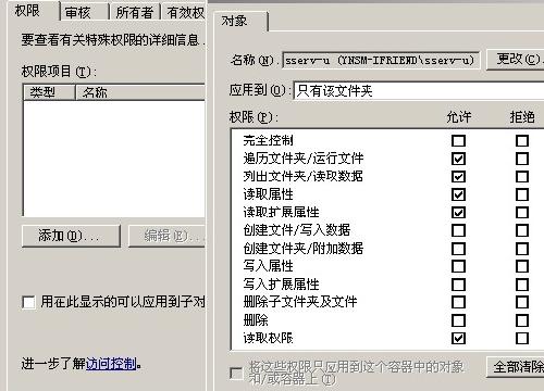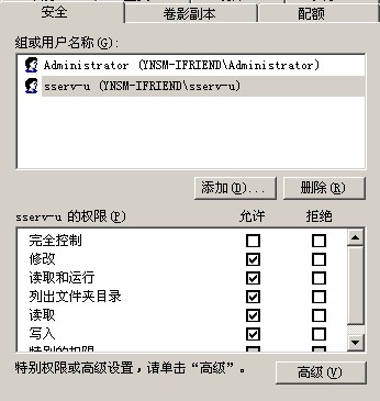 假设你有一个WEB目录,路径是d:\web。那么在这个目录的“安全设定”里除了管理员和IIS用户都删除掉,再加入ERVU账号,切记SYSTEM账号也删除掉。为什么要这样设置呢?因为现在已经是用ERVU账号启动的SERV-U,而不是用SYSTEM权限启动的了,所以访问目录不再是用SYSTEM而是用ERVU,此时SYSTEM已经没有用了,这样就算真的溢出也不可能得到SYSTEM权限。另外,WEB目录所在盘的根目录还要设置允许ERV-U账号的浏览和读取权限,并确认在高级里设置只有该文件夹。(见图14)