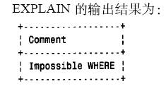 在此情形中,MySQL考察WHERE 子句,如果认识到不可能有满足该查询的行,就不会对该表进行搜索。可利用EXPLAIN 语句知道这一点,EXPLAIN 语句要求MySQL显示某些有关它应该执行一条SELECT 查询,而实际没有执行的信息。为了使用E X P L A I N,只需要SELECT 语句前放置EXPLAIN 即可,如下所示: