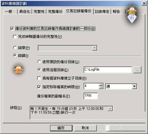 您可以使用数据库维护计划之【属性】对话盒来更改日志传送相关设定。在【交易记录文件备份】设定页提供的选项可更改日志传送过程中交易日志文件备份的组态。