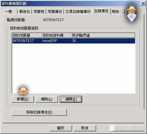 【记录传送】设定页显示出您先前在维护计划内设定的日志传送配对服务器;如果您设定了其它组日志传送配对服务器,也会列在此处。本设定页也包含下列选项:新增目的数据库(用以建立新的日志传送配对服务器)、删除既有日志传送配对服务器、编辑目前的日志传送配对服务器之属性,以及移除整个日志传送功能。